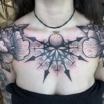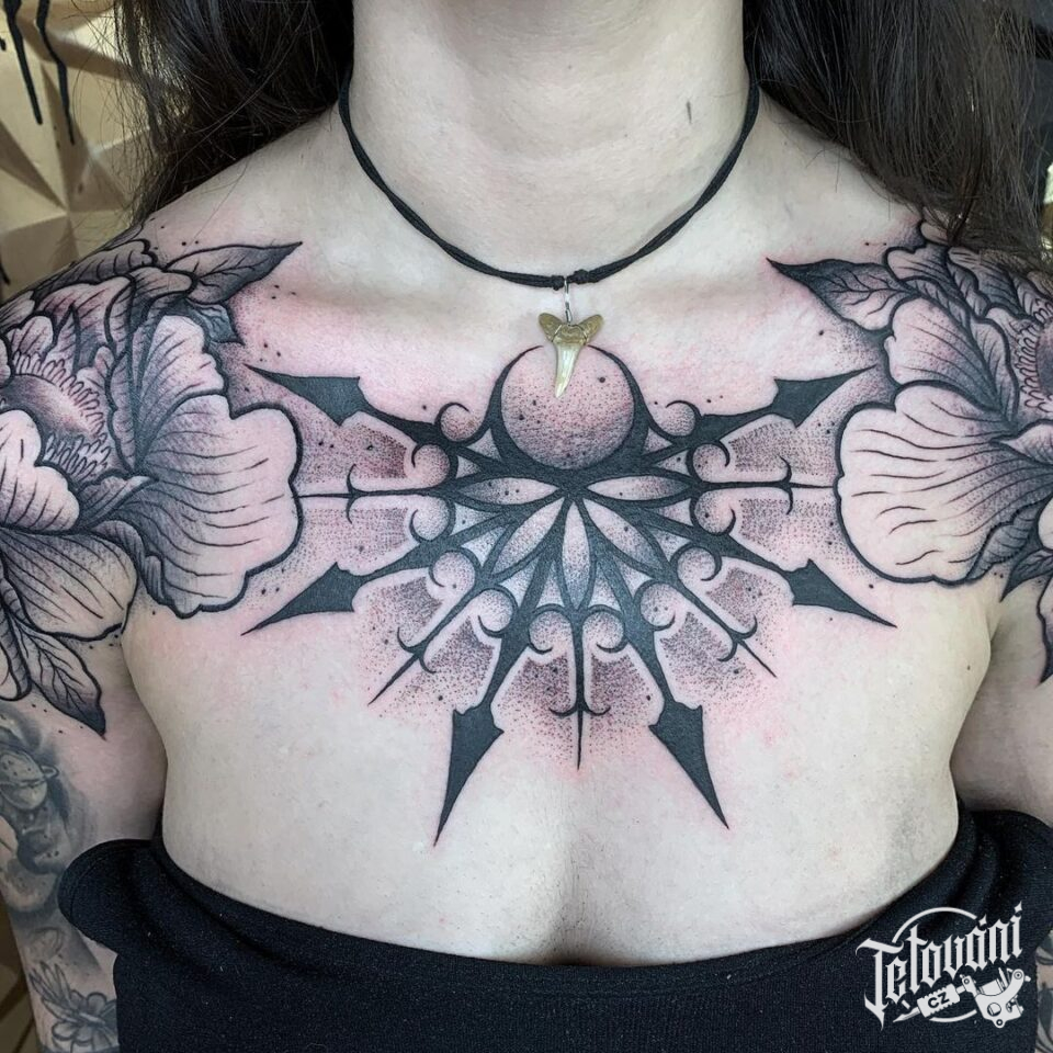 Tetování znaky a symboly, šípky, květiny na hrudník a rameno