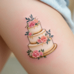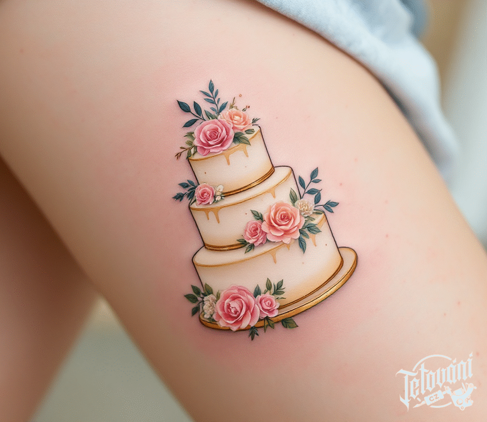 Tetování znaky a symboly, svatební tetování, dort a svatba na boku stehna