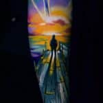 Tetování znaky a symboly svobody, života, moře, slunce na předloktí