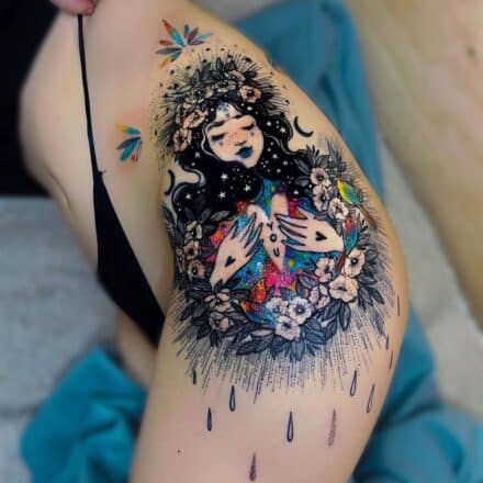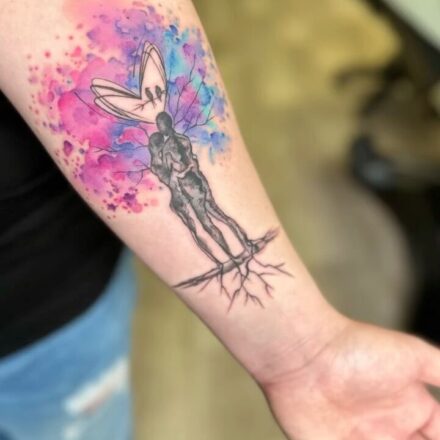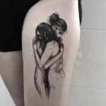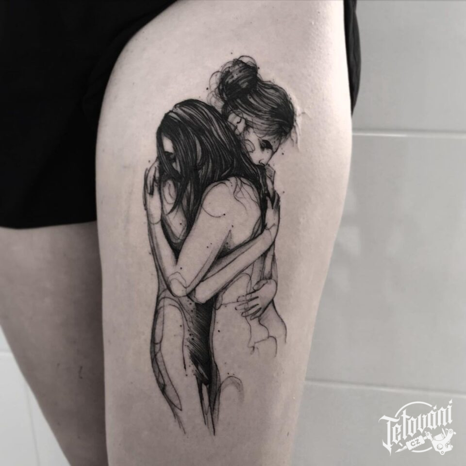Tetování znaky a symboly, symbol lásky, objetí muž a žena na stehně