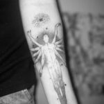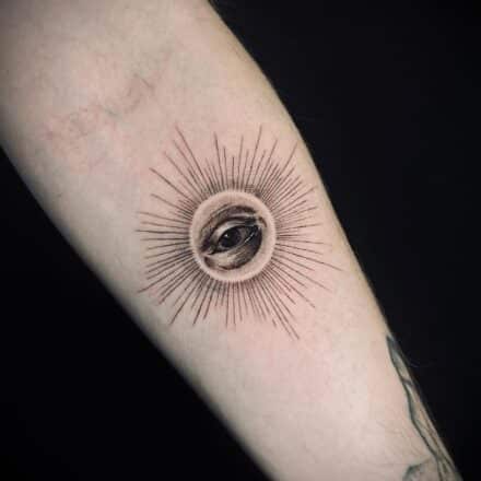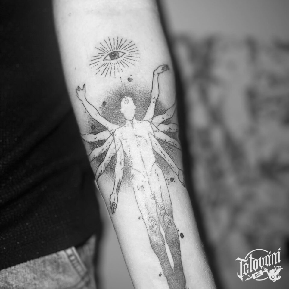 Tetování znaky a symboly, symbol náboženství a oko, boží oko na předloktí
