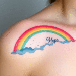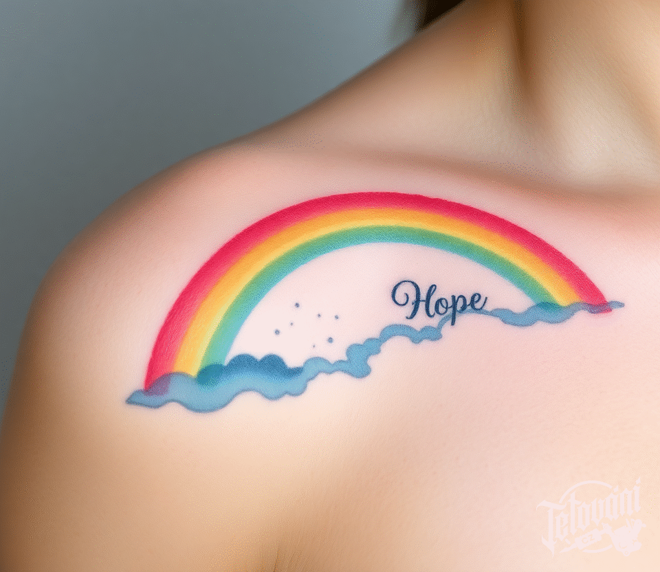 Tetování znaky a symboly, symbol naděje duha a nápis pod klíční kostí
