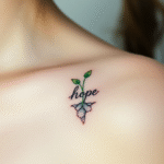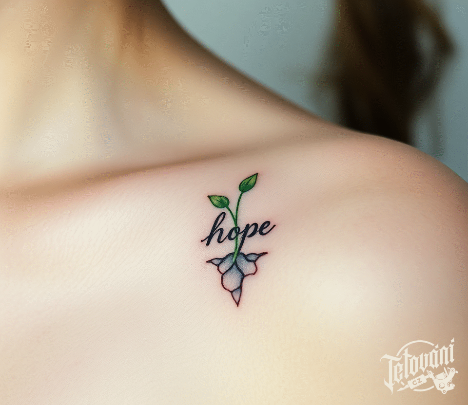 Tetování znaky a symboly, symbol naděje, květina a nápis na klíční kost