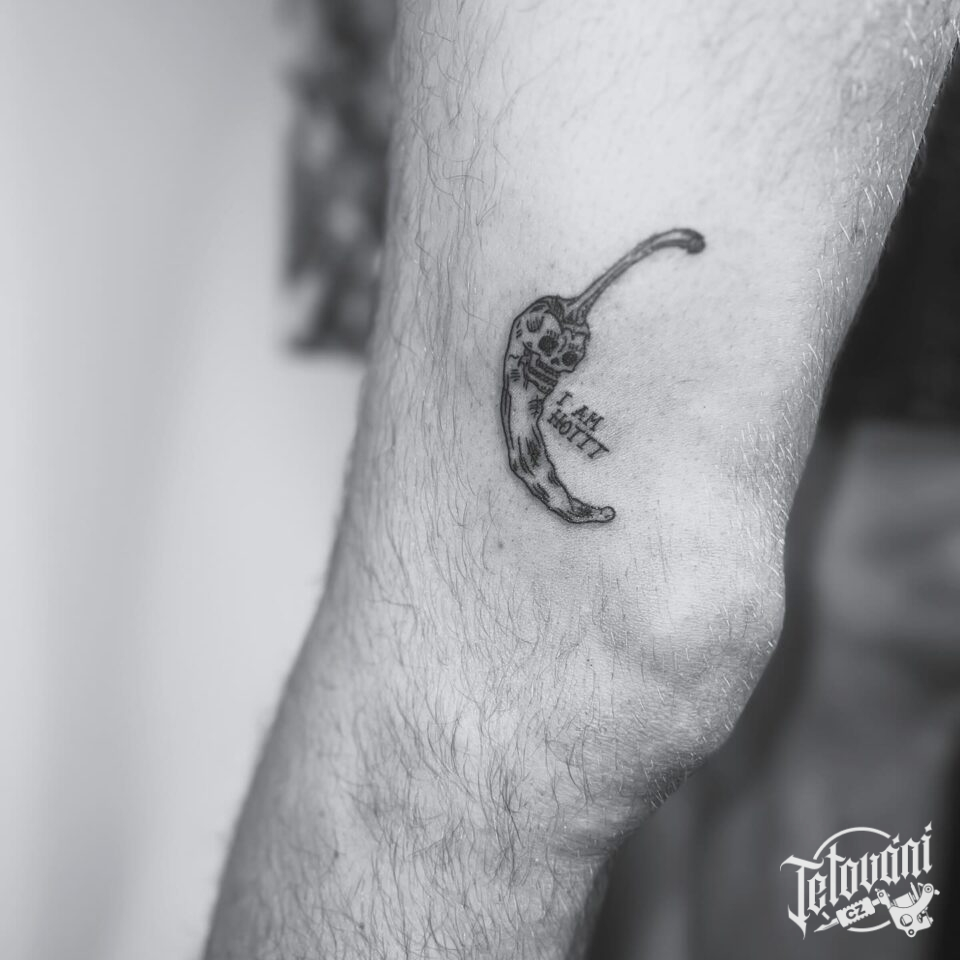 Tetování znaky a symboly, symbol zdraví, lebka a nápis na stehno
