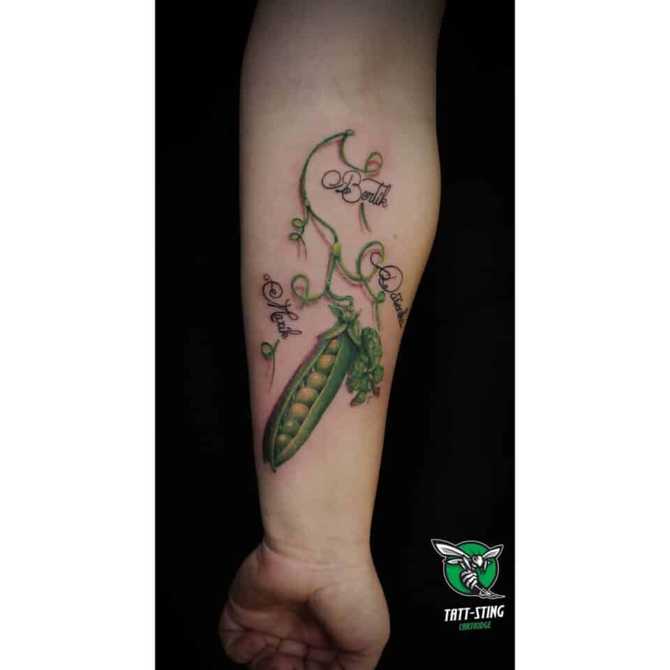Tetování znaky a symboly, symbol zdraví se jmény na předloktí
