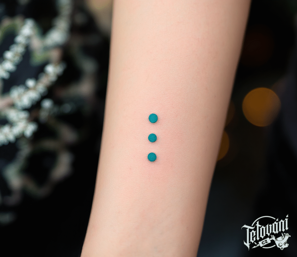 Tetování znaky a symboly, tři tyrkysové tečky na předloktí
