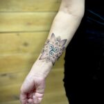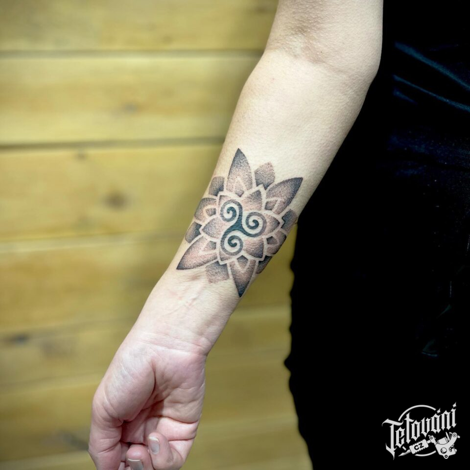 Tetování znaky a symboly, triskelion s mandalou na předloktí