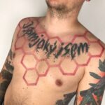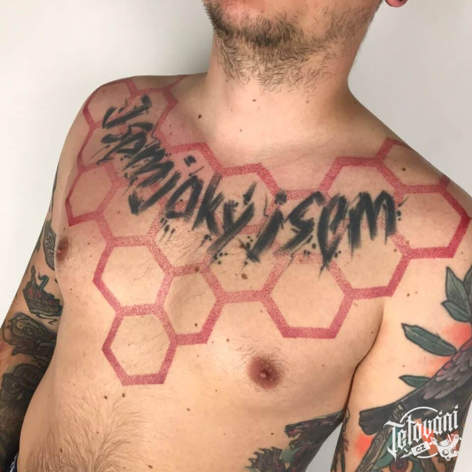 Tetování znaky a symboly, tvary s nápisem na hrudi