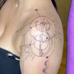 Tetování znaky a symboly, tvary, tečky, šipky, čáry na rameni