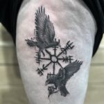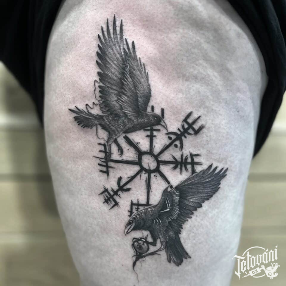 Tetování znaky a symboly Vikingů, zvířata, ptáci na boku stehna