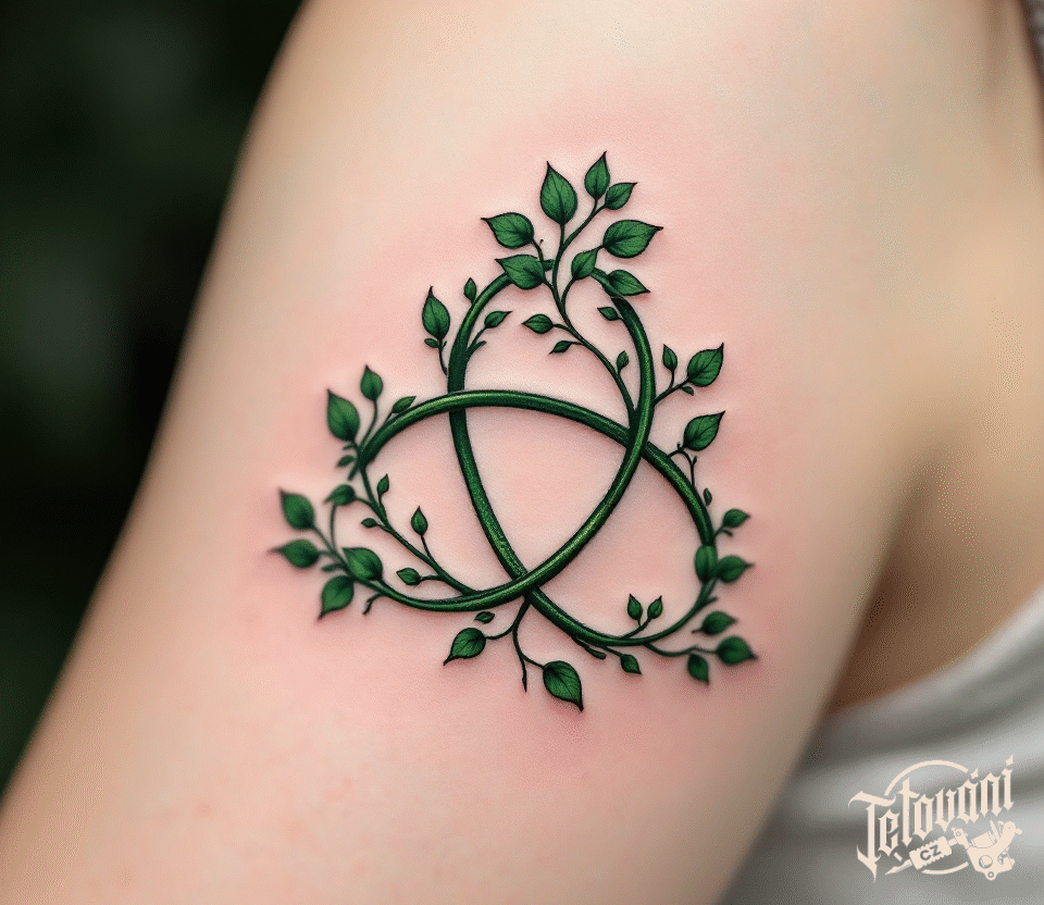 Tetování znaky a symboly z mytologie, triquetra a větvičky listí na rameno