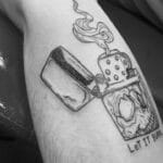 Tetování předměty, zapalovač, lebka, nápis na předloktí