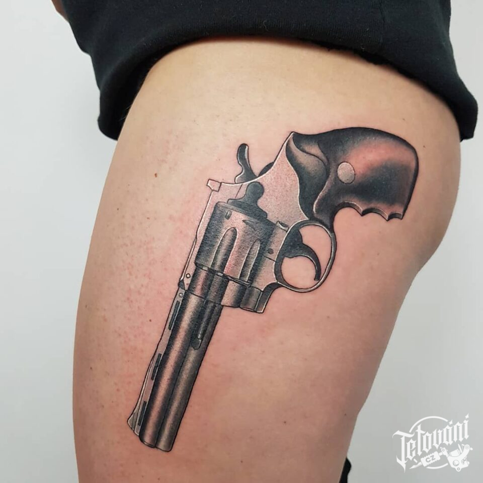 Tetování znaky a symboly, zbraň na boku stehna