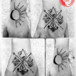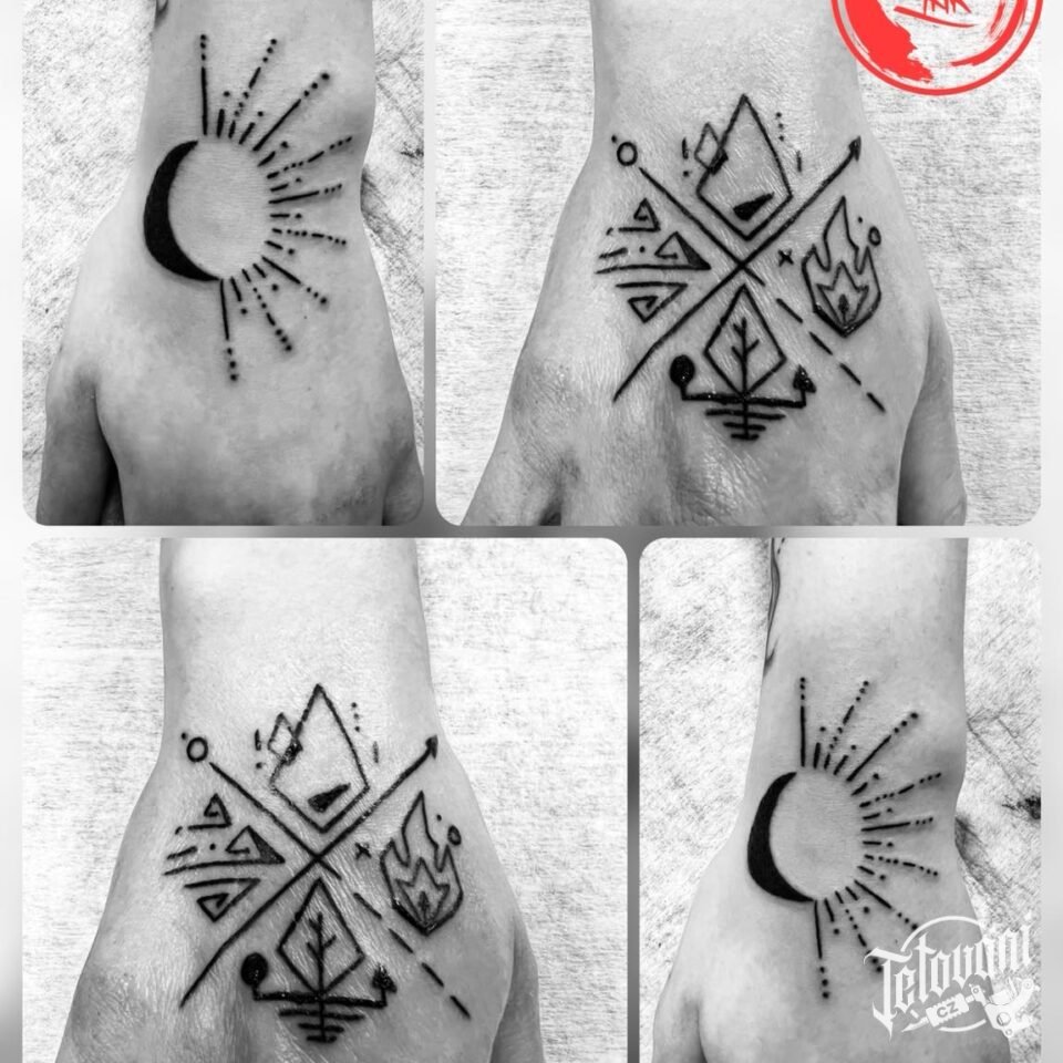 Tetování znaky a symboly, živly, Slunce a Měsíc na hřbetu ruky