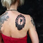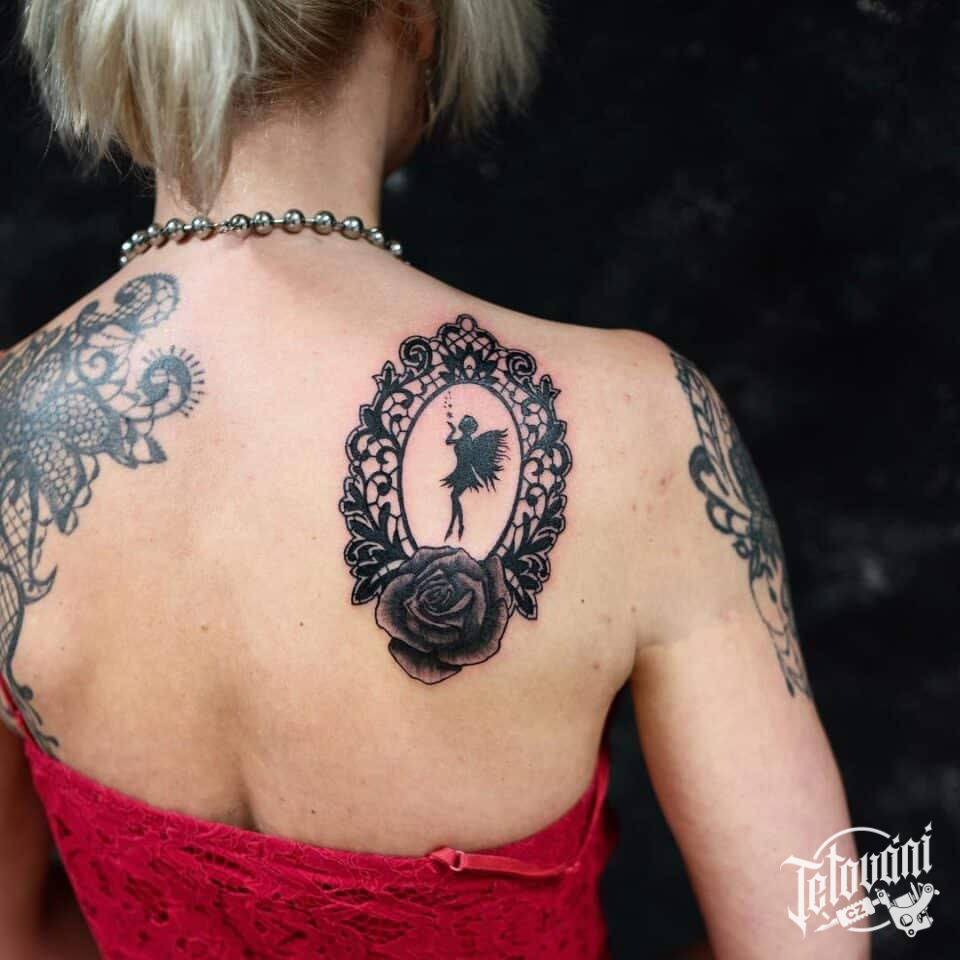 Tetování znaky a symboly, zrcadlo, růže a nadpřirozená bytost, víla na lopatce