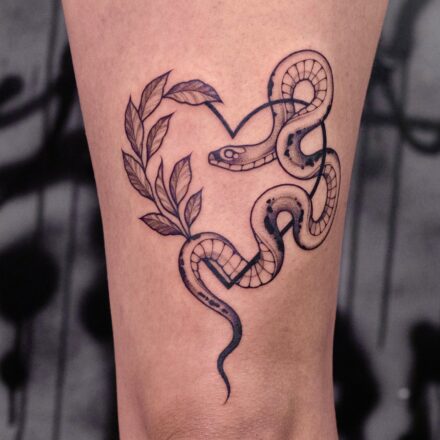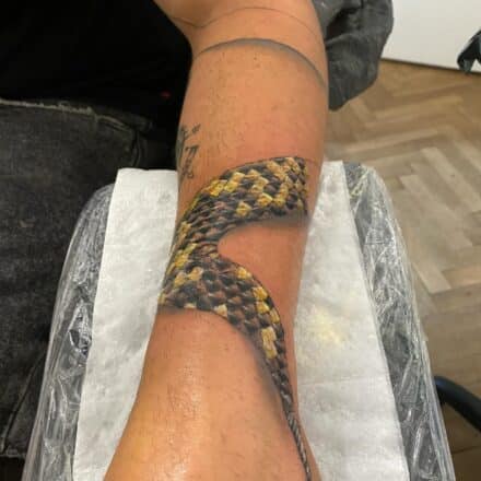 Tetování znaky a symboly, zvíře, had, čáry, tečky na lýtku