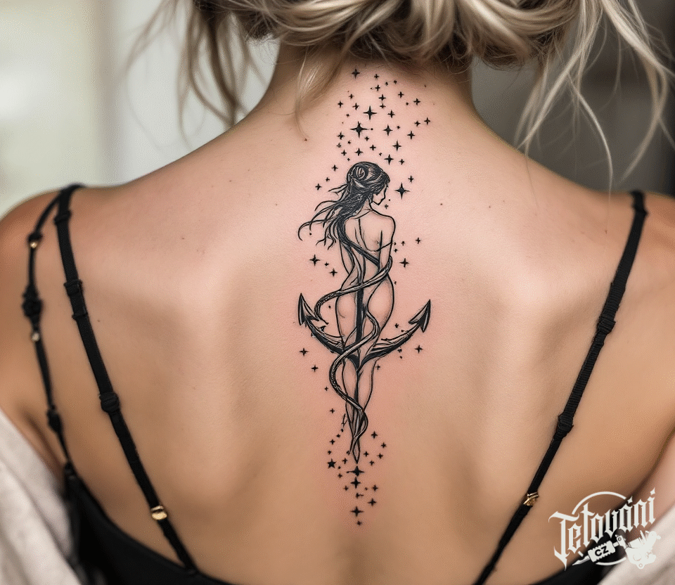 Tetování znamení a souhvězdí zvěrokruhu panna na páteř