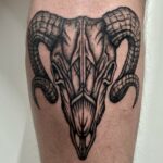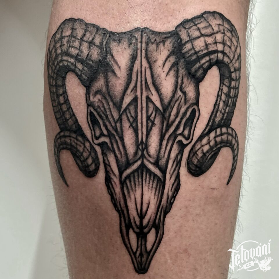 Tetování znamení a zvíře zvěrokruhu beran, lebka na lýtko
