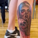 Tetování znamení zla, lebka, kostra ruky, čarodějnice na lýtku