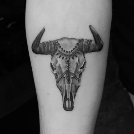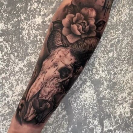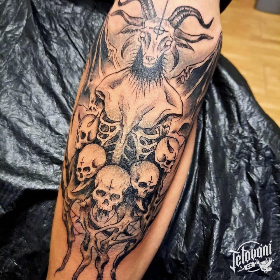 Tetování znamení zla, lebky a zvířata, beran na předloktí