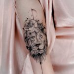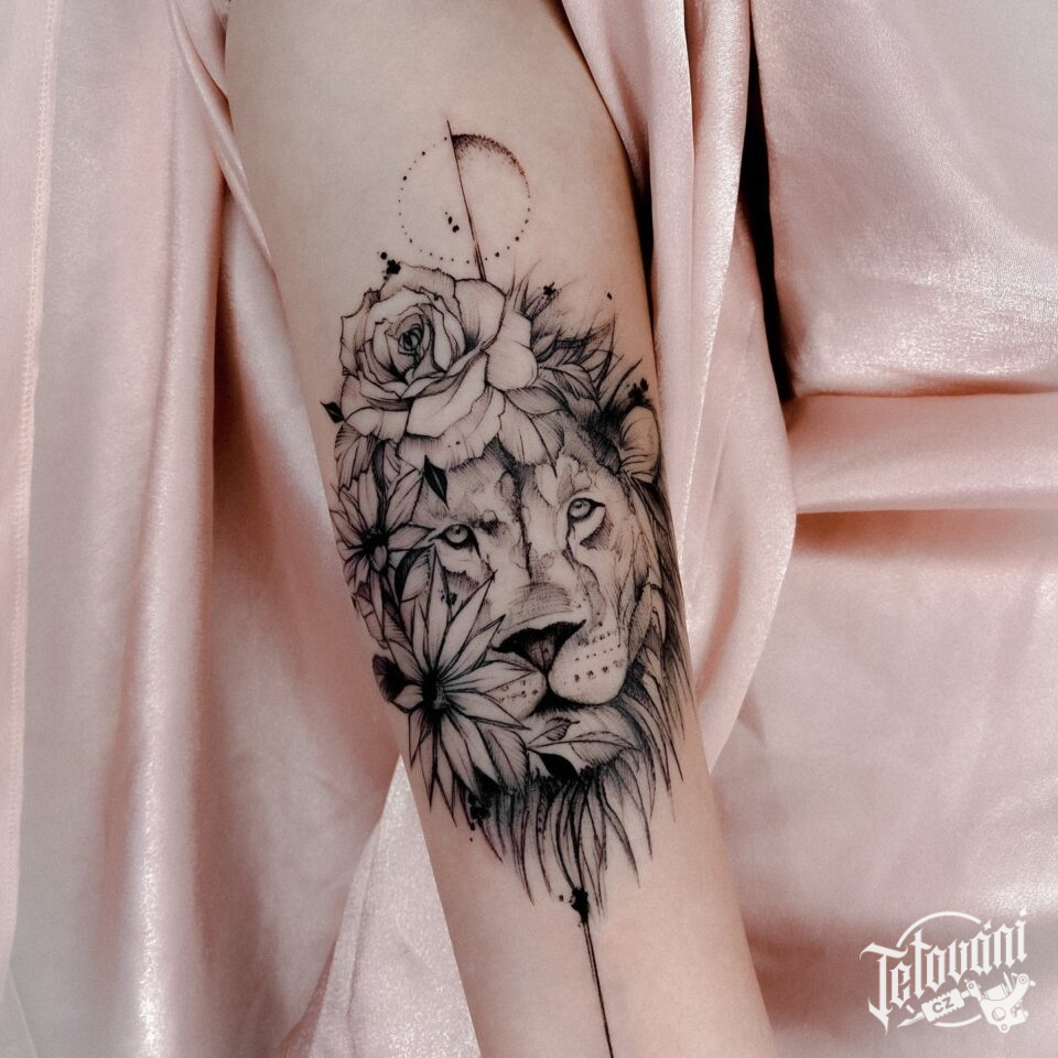 Tetování znamení zvěrokruhu a zvíře lev, květina růže na paži