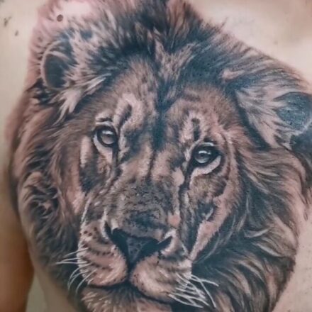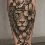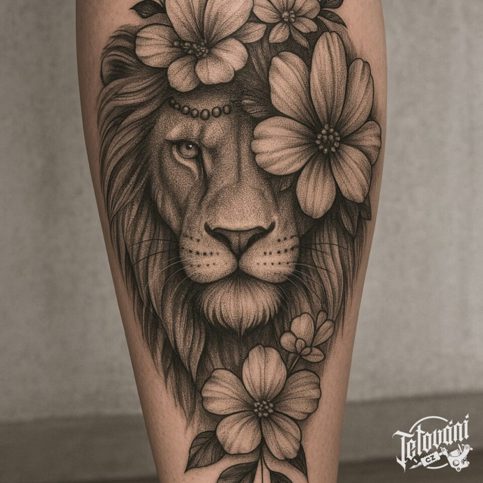 Tetování znamení zvěrokruhu a zvíře lev, květiny na lýtko