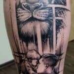 Tetování znamení zvěrokruhu a zvíře lev, rodina, děti na lýtko
