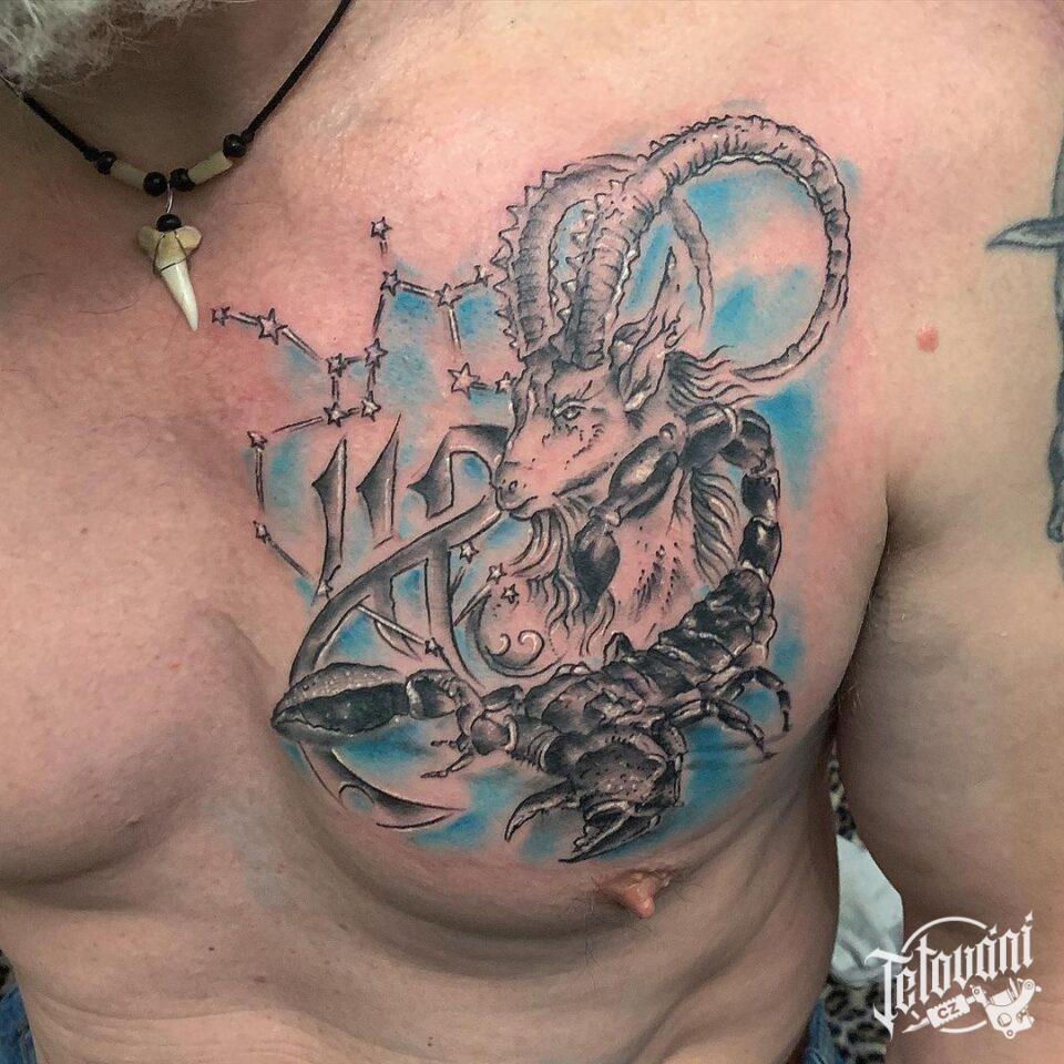Tetování znamení zvěrokruhu, kozoroh a štír na hrudi