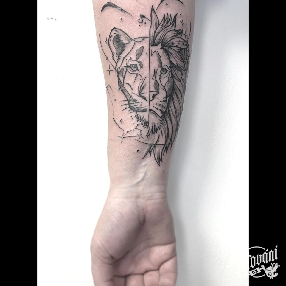 Tetování znamení zvěrokruhu, lev a lvice na předloktí