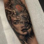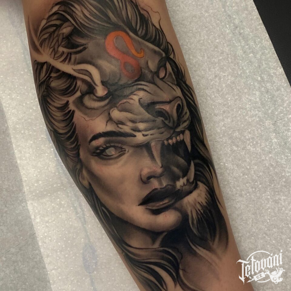 Tetování znamení zvěrokruhu, lev a žena na předloktí