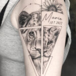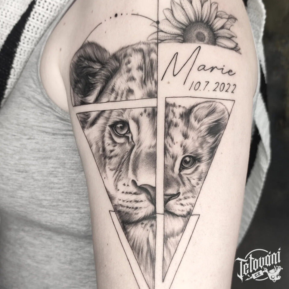 Tetování znamení zvěrokruhu lev s nápisem, jméno dítěte s narozením na rameno
