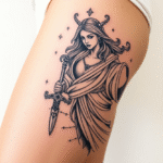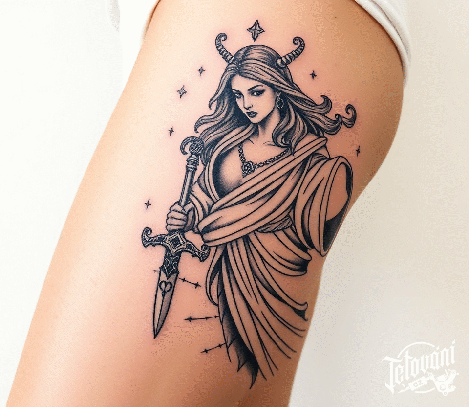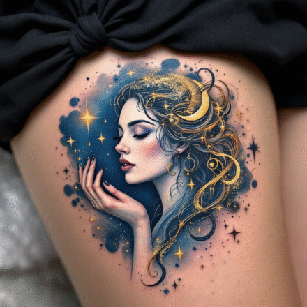 Tetování znamení zvěrokruhu Panna na boku stehna
