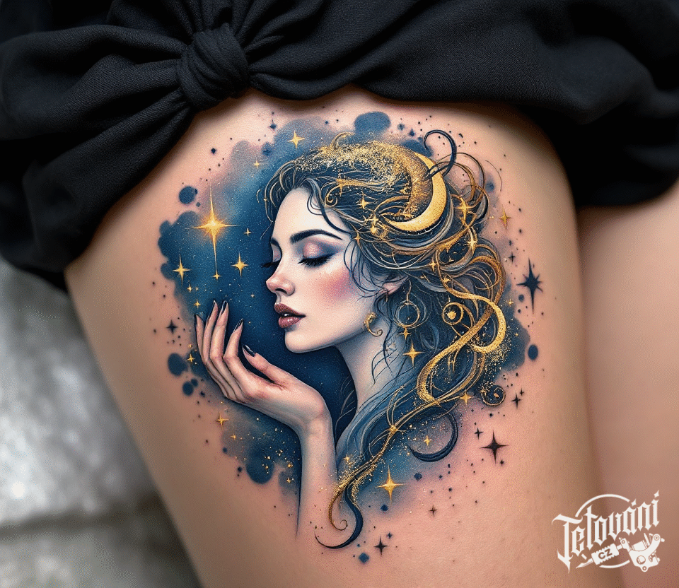Tetování znamení zvěrokruhu Panna na stehně