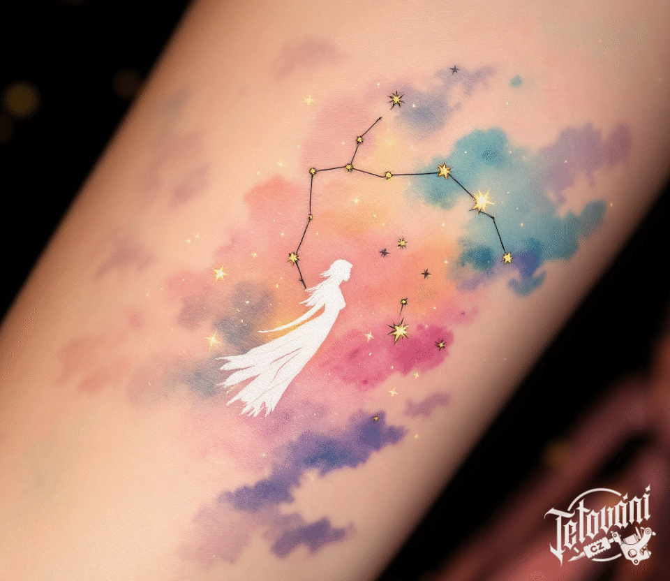 Tetování znamení zvěrokruhu panna, souhvězdí panny na rameno