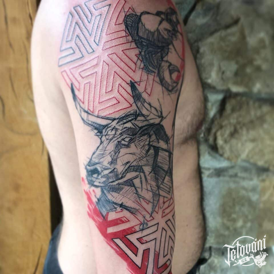 Tetování zvířata, býk a rak znamení zvěrokruhu na paži
