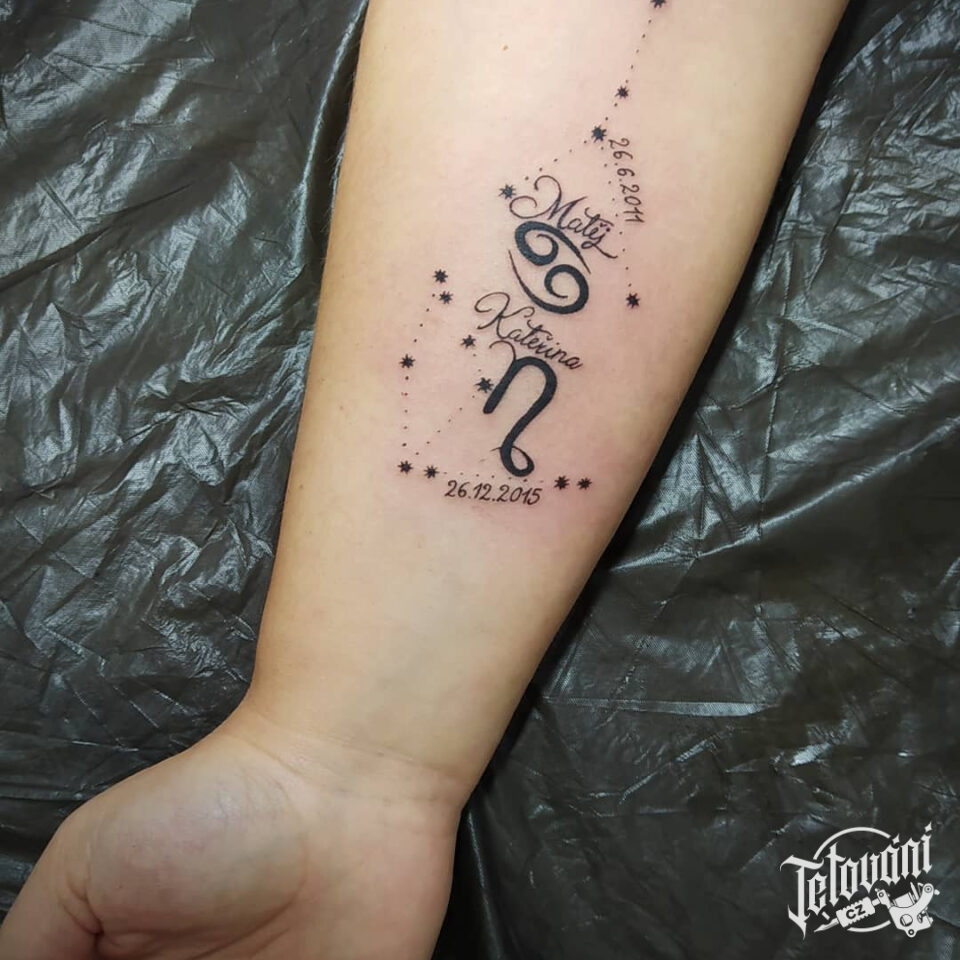 Tetování znamení zvěrokruhu, rak znamení zvěrokruhu, kozoroh znamení zvěrokruhu, jména dětí, datum narození na předloktí