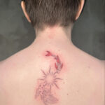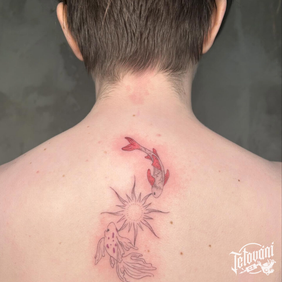 Tetování znamení zvěrokruhu, ryby a slunce na páteř