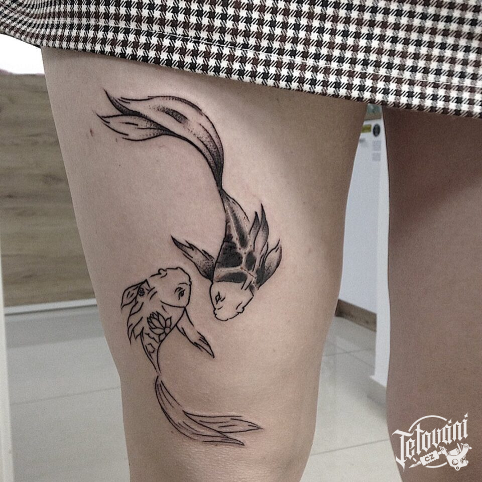 Tetování znamení zvěrokruhu, ryby na stehnu