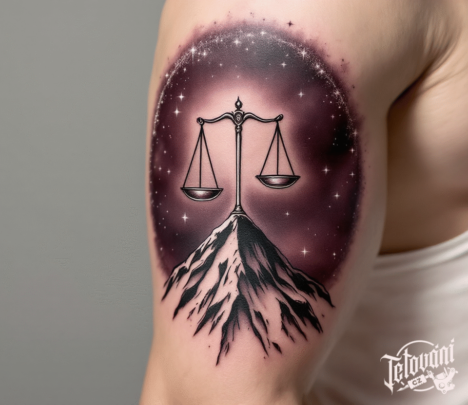 Tetování znamení zvěrokruhu se souhvězdí vah, astrologie, příroda hory na rameno