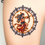 Tetování znamení zvěrokruhu, střelec, žena a ornamenty na boku stehna
