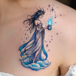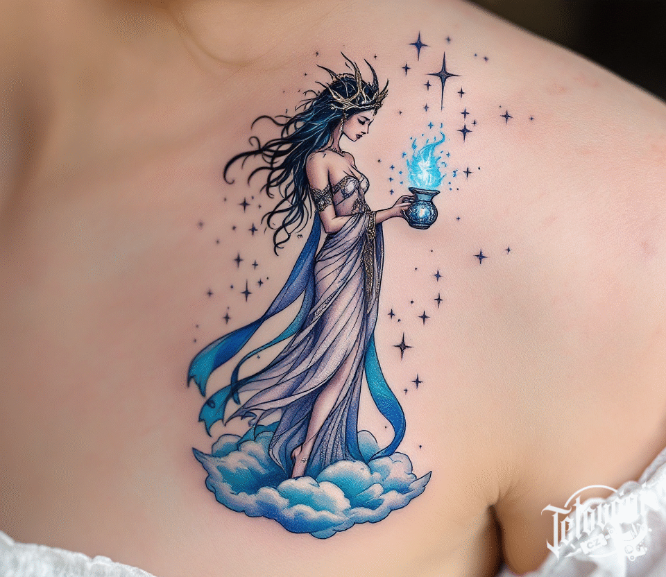 Tetování žena, znamení zvěrokruhu, vodnářka na hrudník
