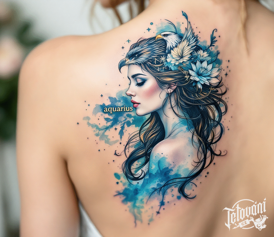 Tetování znamení zvěrokruhu, vodnář, žena, zvířata, pták a květiny na lopatce