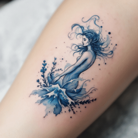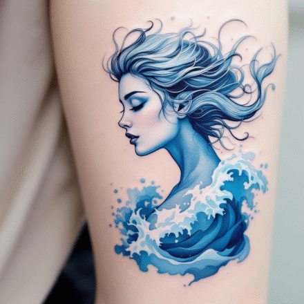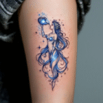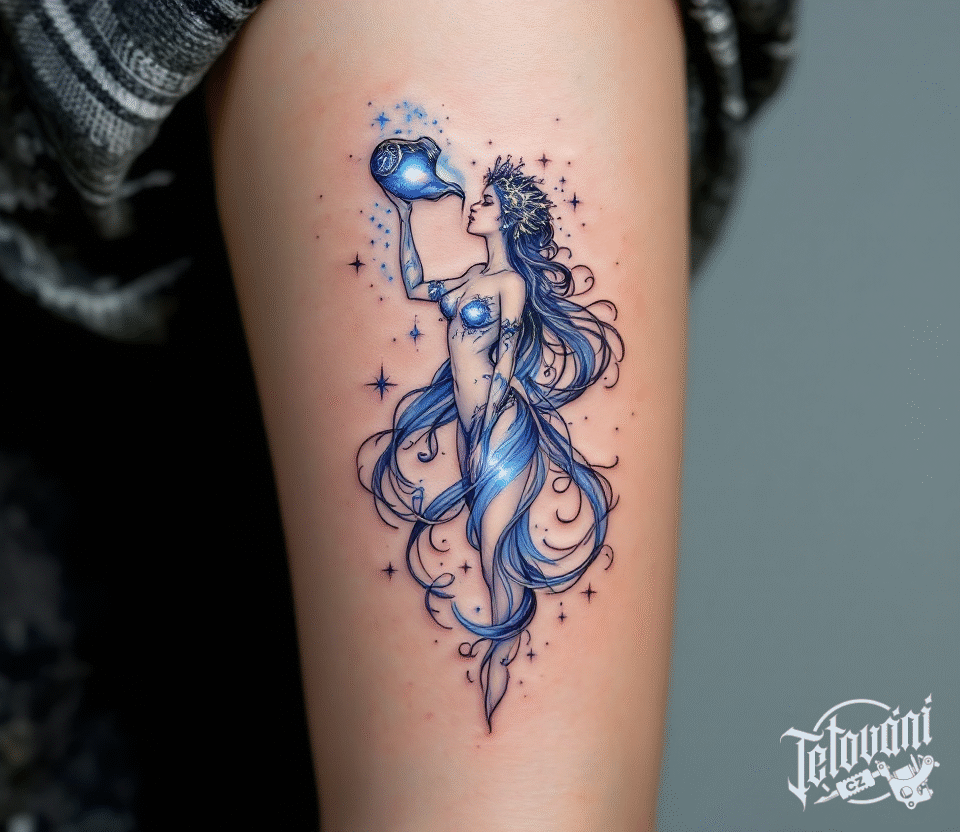 Tetování znamení zvěrokruhu vodnář, žena a předmět, džbán, živel na rameno