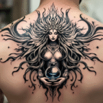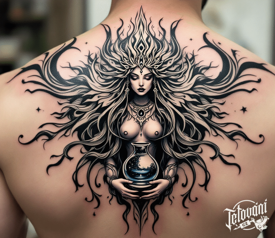 Tetování žena, znamení zvěrokruhu, vodnář a ornamenty na záda