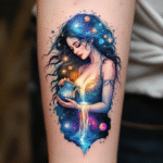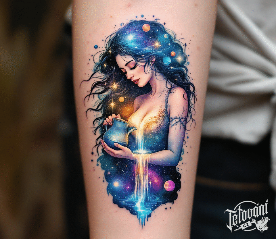 Tetování znamení zvěrokruhu, vodnář, žena a vesmír na předloktí