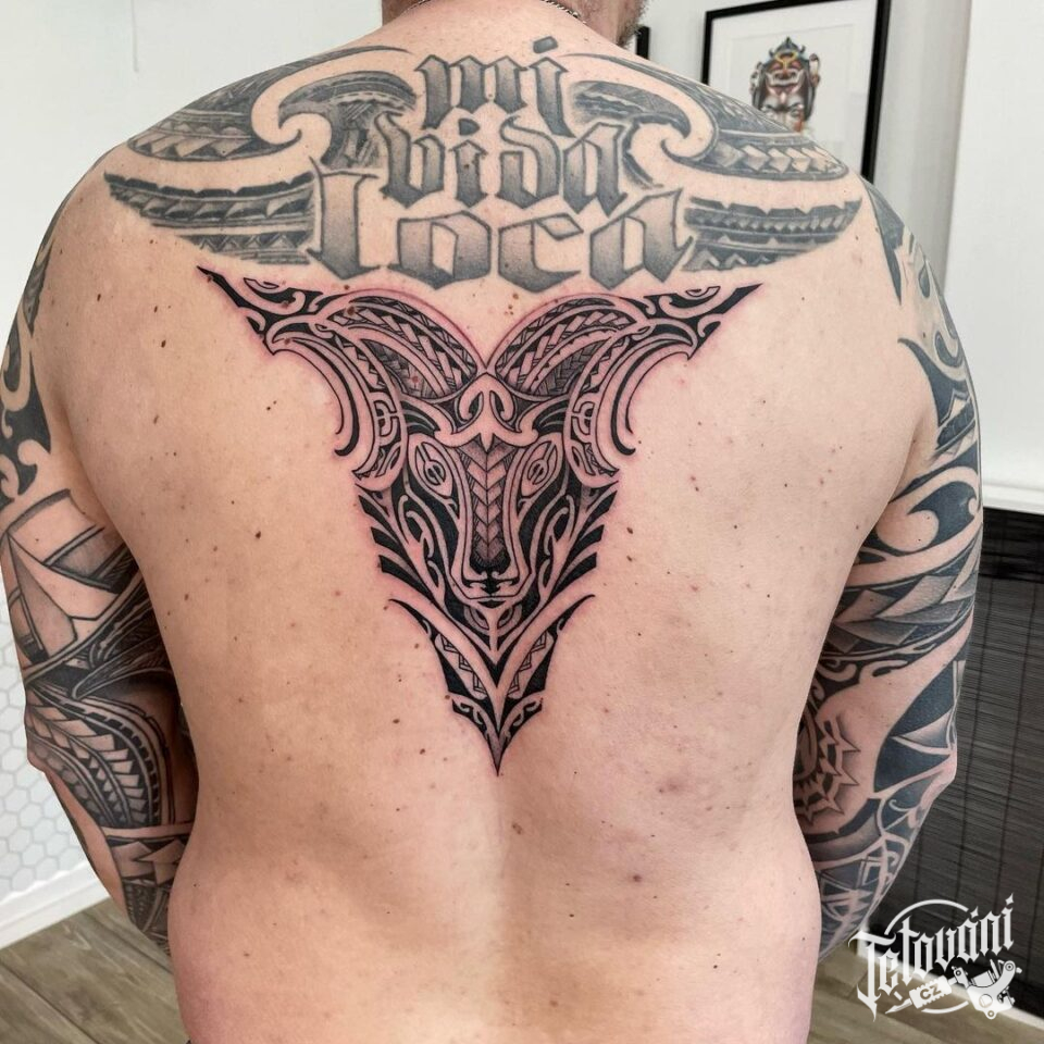 Tetování znamení zvěrokruhu, zvíře, beran na zádech