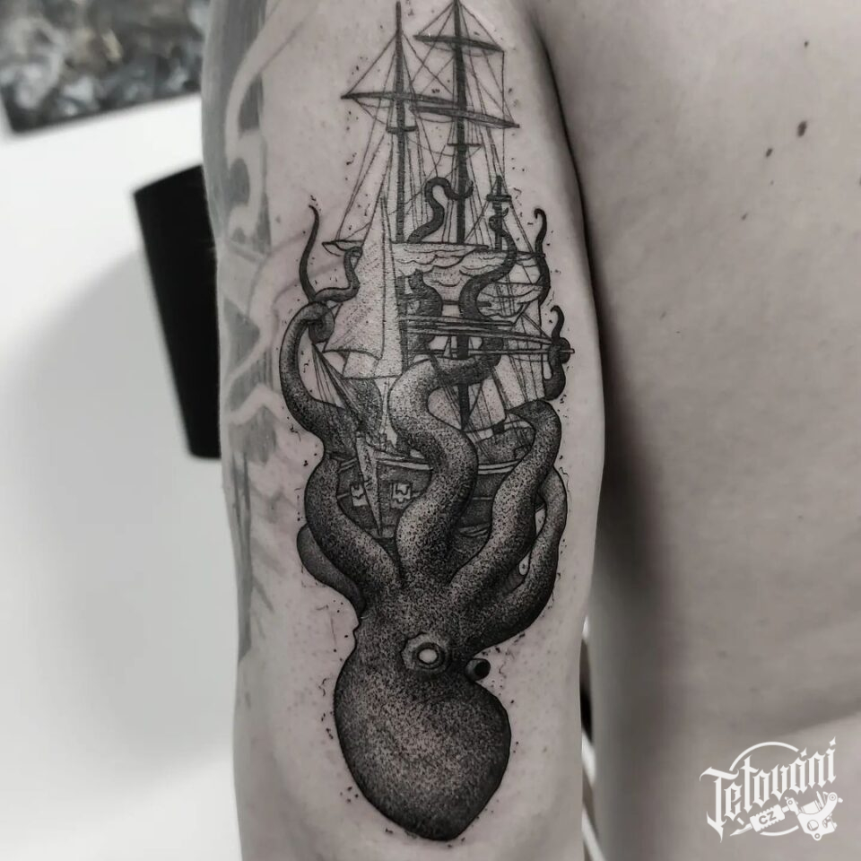 Tetování zvířata a dopravní prostředky, chobotnice a loď na paži