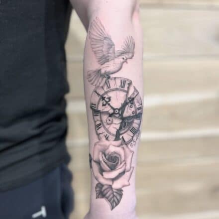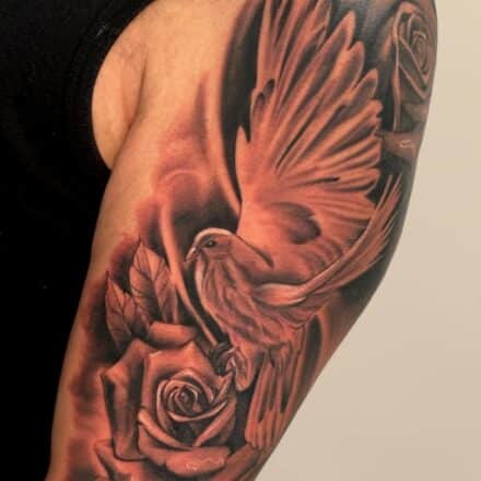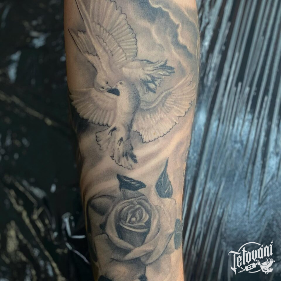 Tetování zvířata a květiny, holubice a růže na předloktí