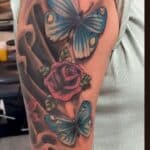 Tetování zvířata a květiny, motýl a růže na rameni