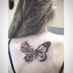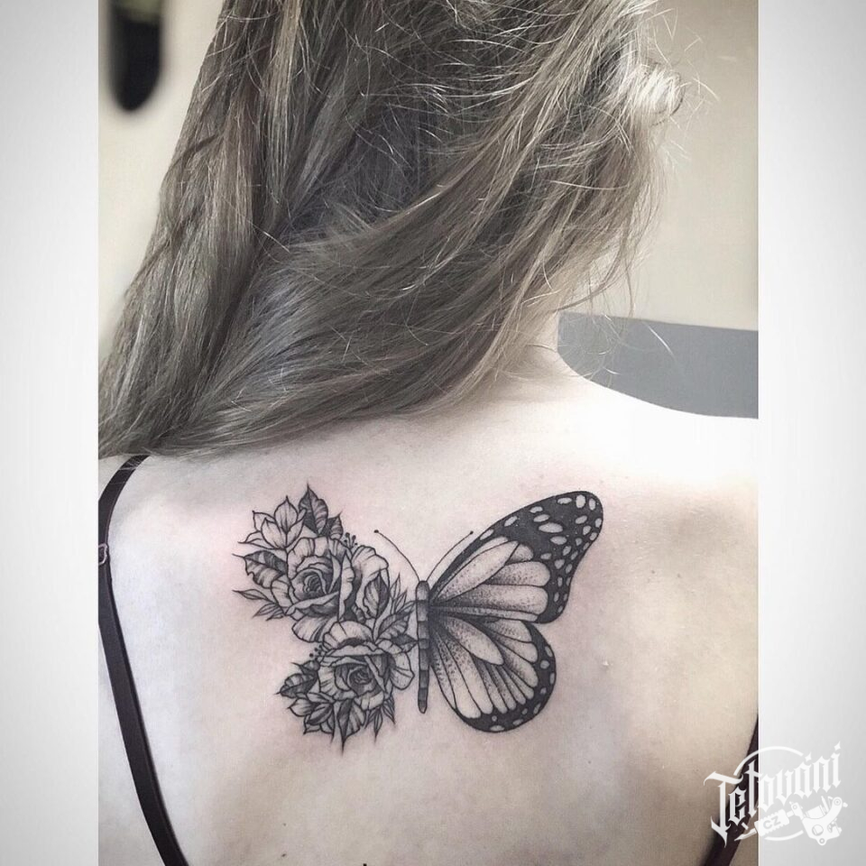 Tetování zvířata a květiny, motýl s růžemi na zádech